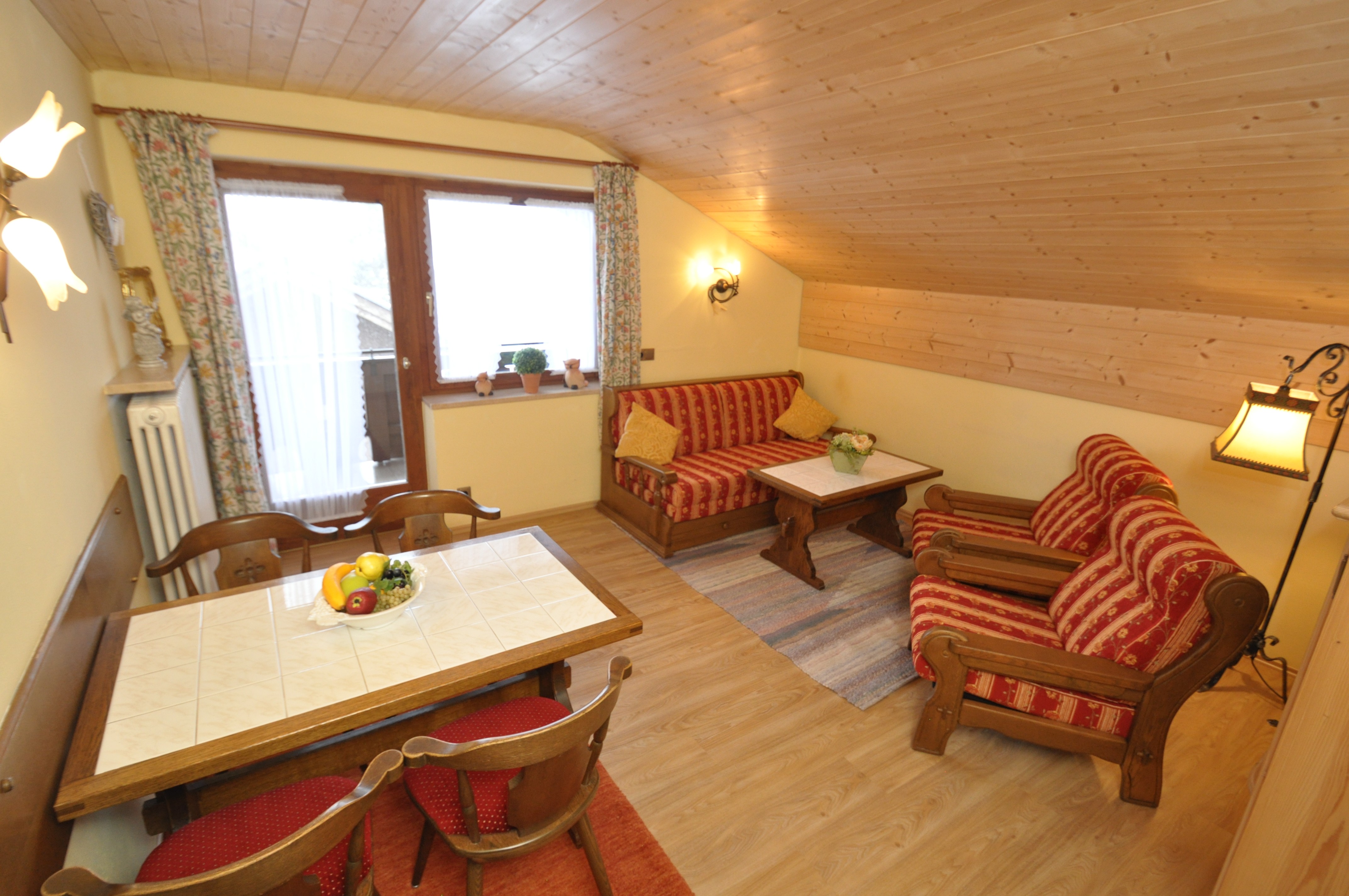 Gemütliches Wohnzimmer mit Essbereich und Schlafcouch für 2 Pers