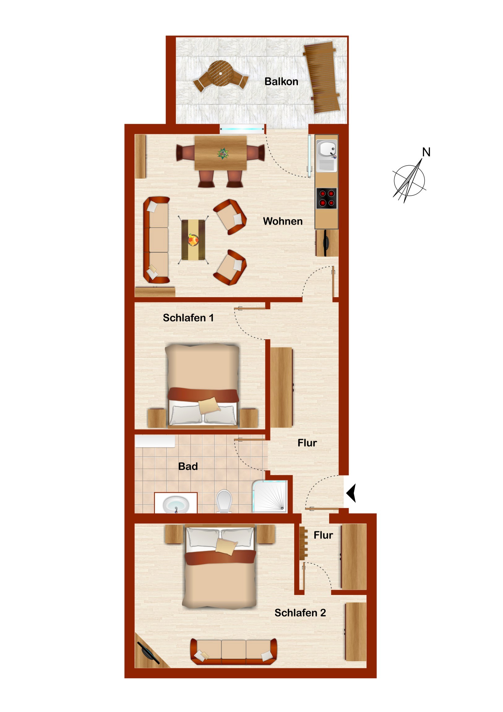 2 separate Doppelschlafzimmer | zweites Schlafzimmer mit zusätzlicher Schlafmöglichkeit | Wohnraum mit Küchenzeile, Spülmaschine und Essplatz | gemütliche Sitzecke | Bad mit Dusche